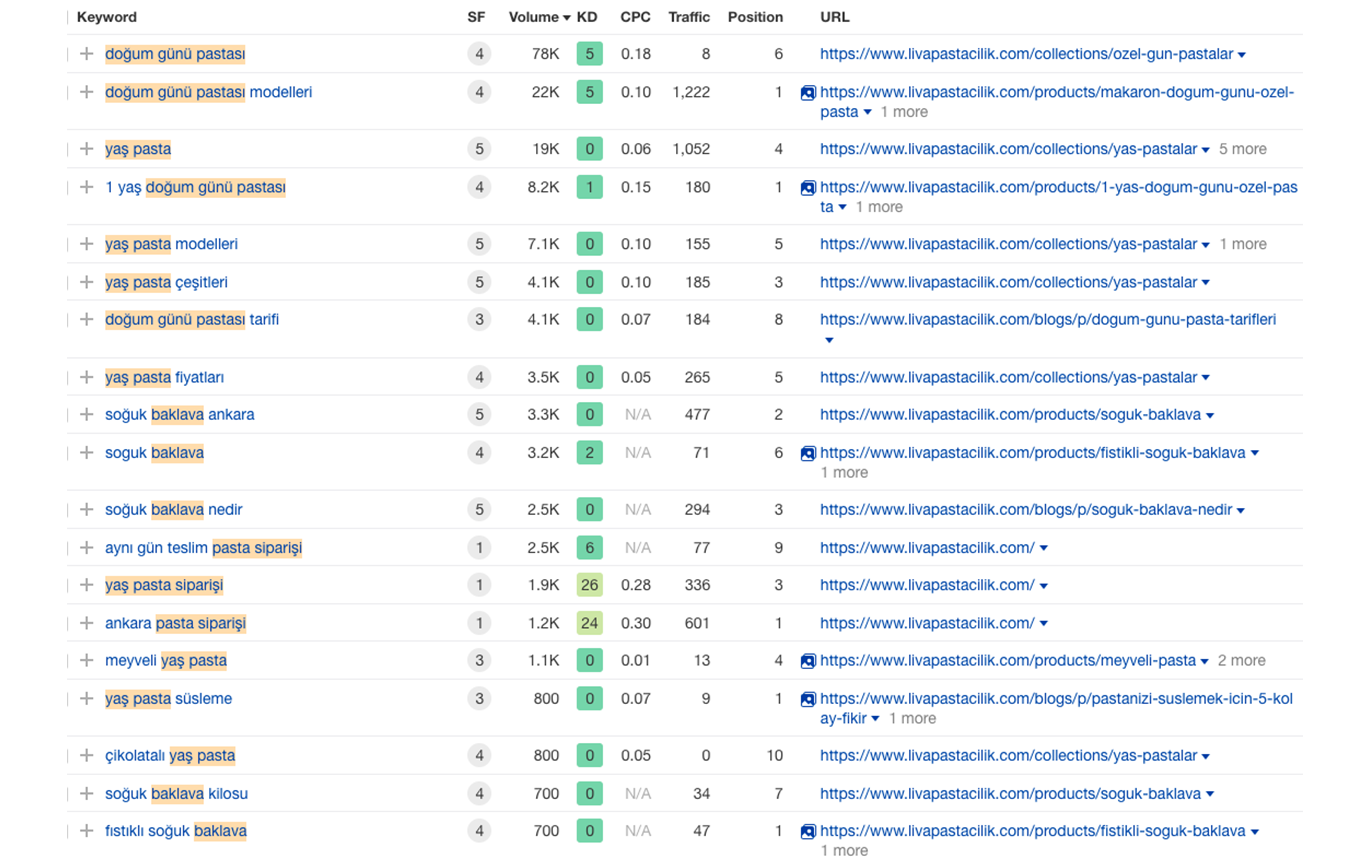 Aşağıdaki tabloda görüldüğü gibi sektörde öne çıkan “doğum günü pastası”, “pasta siparişi”, “yaş pasta”, “baklava” gibi hedef kelimelerde ilk 3 sırada pozisyonlanmaktayız. Ayrıca mevcut durumda arama motorlarından aylık toplamda 30.776 kelime öbeğinden organik trafik edinmekteyiz.